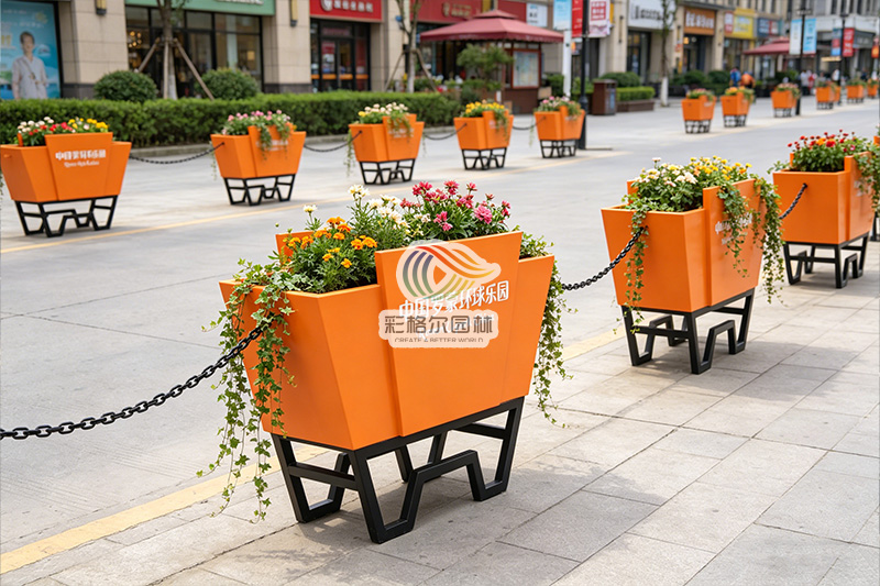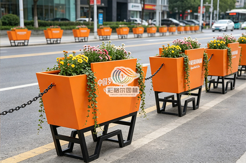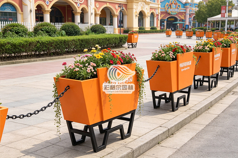 作为游乐园定制花箱,它深度契合罗蒙环球乐园的主题风格,采用高饱和度的活力橙配色,瞬间成为视觉焦点,与乐园的欢乐氛围完美呼应。箱体表面可定制专属乐园名称与标识,将景区 IP 与景观设施深度融合,让每一组花箱都成为传递乐园品牌形象的流动名片,既强化了场景辨识度,又为游客营造了沉浸式的游览环境。