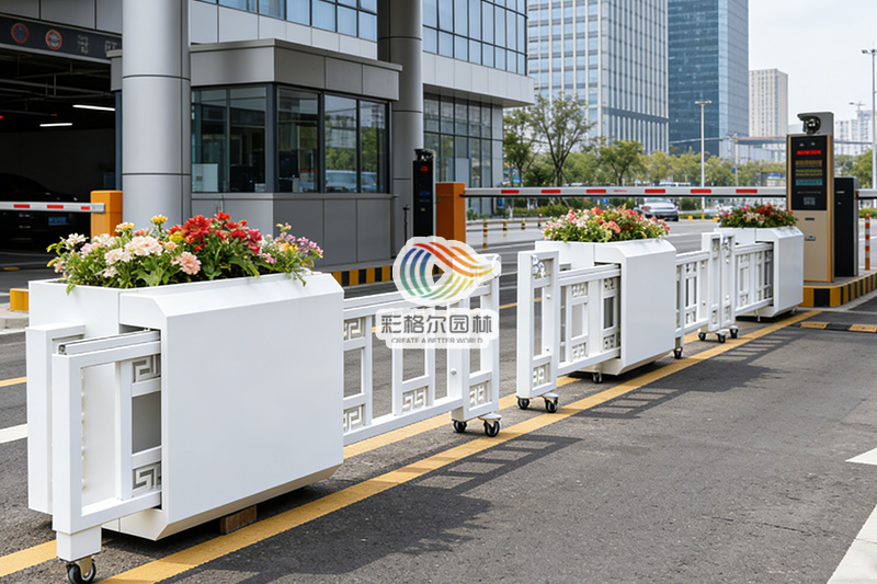 产业园区 / 住宅小区出入口规范大门车流人流管理,临时管控、消杀隔离、车辆分流都可适配;一体化花箱设计优化园区绿化观感,简约整洁,降低后期维护压力。