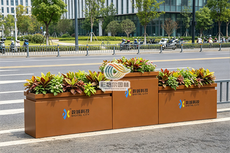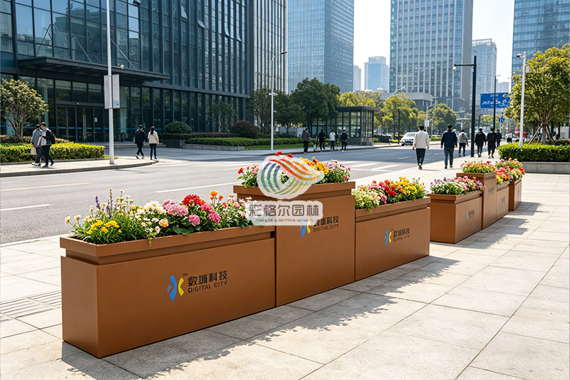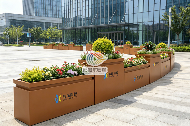 作为隔离花箱,它以柔性边界划分人车动线,实现秩序与通透感并存;搭配时令花卉后,又化身为广场花池与景观花池,为园区注入四季生机;定制标识更让它成为品牌的无声名片,传递企业对美学与细节的追求。