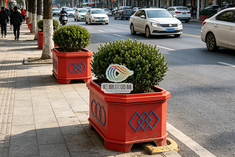 这款防撞花箱,把 “安全” 刻进了骨子里。多边形加厚箱体搭配多圈管材加固,结构稳如磐石,无惧车辆意外剐蹭与碰撞,结实耐造,就算在车流密集的市政道路上,也能稳稳伫立。高饱和度的正红配色,自带天然警示 buff,老远就能被看见,无需额外反光标识,就能有效提醒车辆减速避让,在交通路口筑起一道清晰又温柔的边界,既守护了行人安全,也为城市道路增添一抹亮眼的色彩。